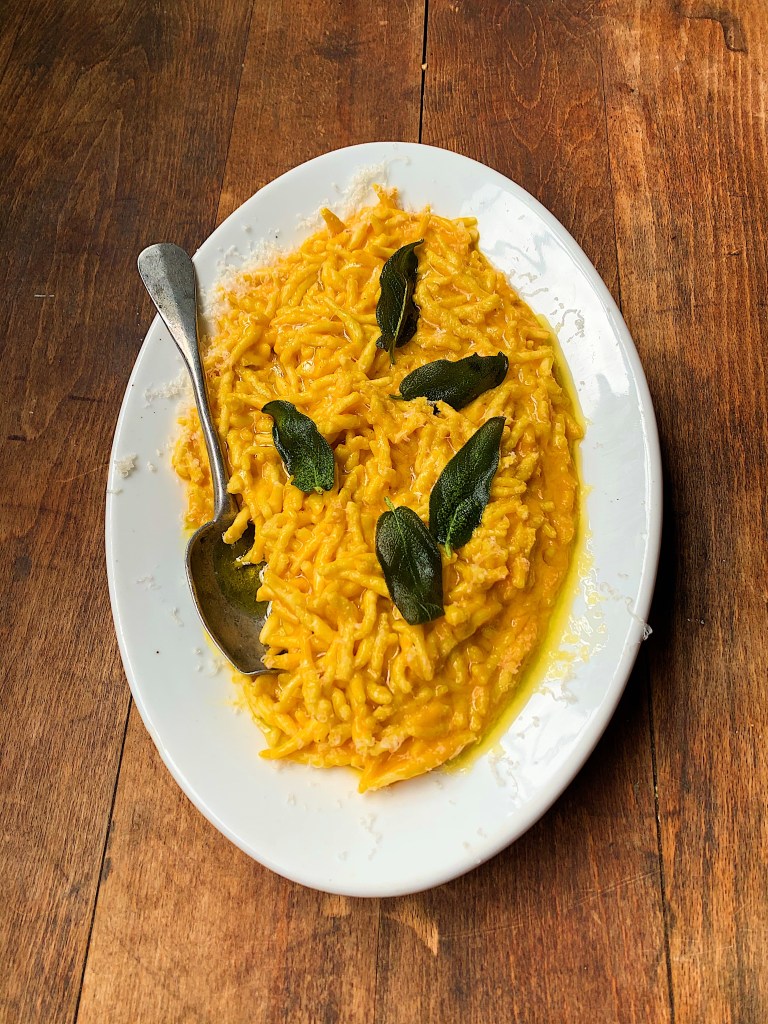 - Cook the pasta in a large pan of boiling, salted water according to the packet instructions. Once cooked, use tongs to drag your pasta from the cooking pan into the mixing bowl. The idea here is to take a little of the pasta cooking water with the cooked pasta to slightly loosen the pumpkin mixture. Toss together until all the pasta is evenly coated and serve in warm bowls. Finish with a little extra grating of nutmeg, a few leaves of sage cooked in hot oil (if you have them) and a drizzle of olive oil.